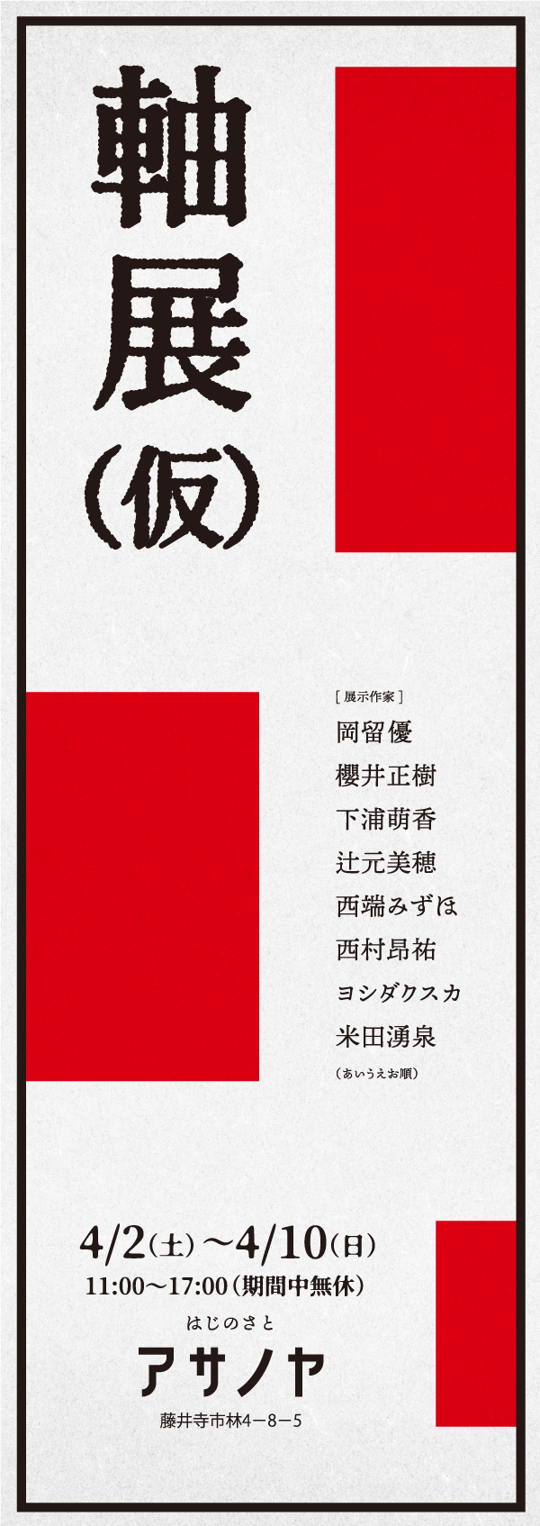 4/2(土)~4/10(日)、はじのさとアサノヤにゆかりのある8人の作家によるグループ展「軸展(仮)」が行われます。
