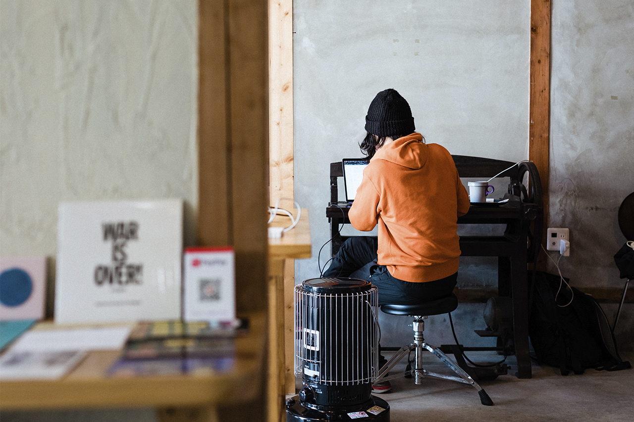 下浦萌香さんは、昨年の春大学院を卒業した若手作家。 様々な技法を用いて創作に取り組む下浦さん。今回は「デカルコマニー」という転写の手法を使った作品でいっぱいのNowhere Hajinosatoとなりました。