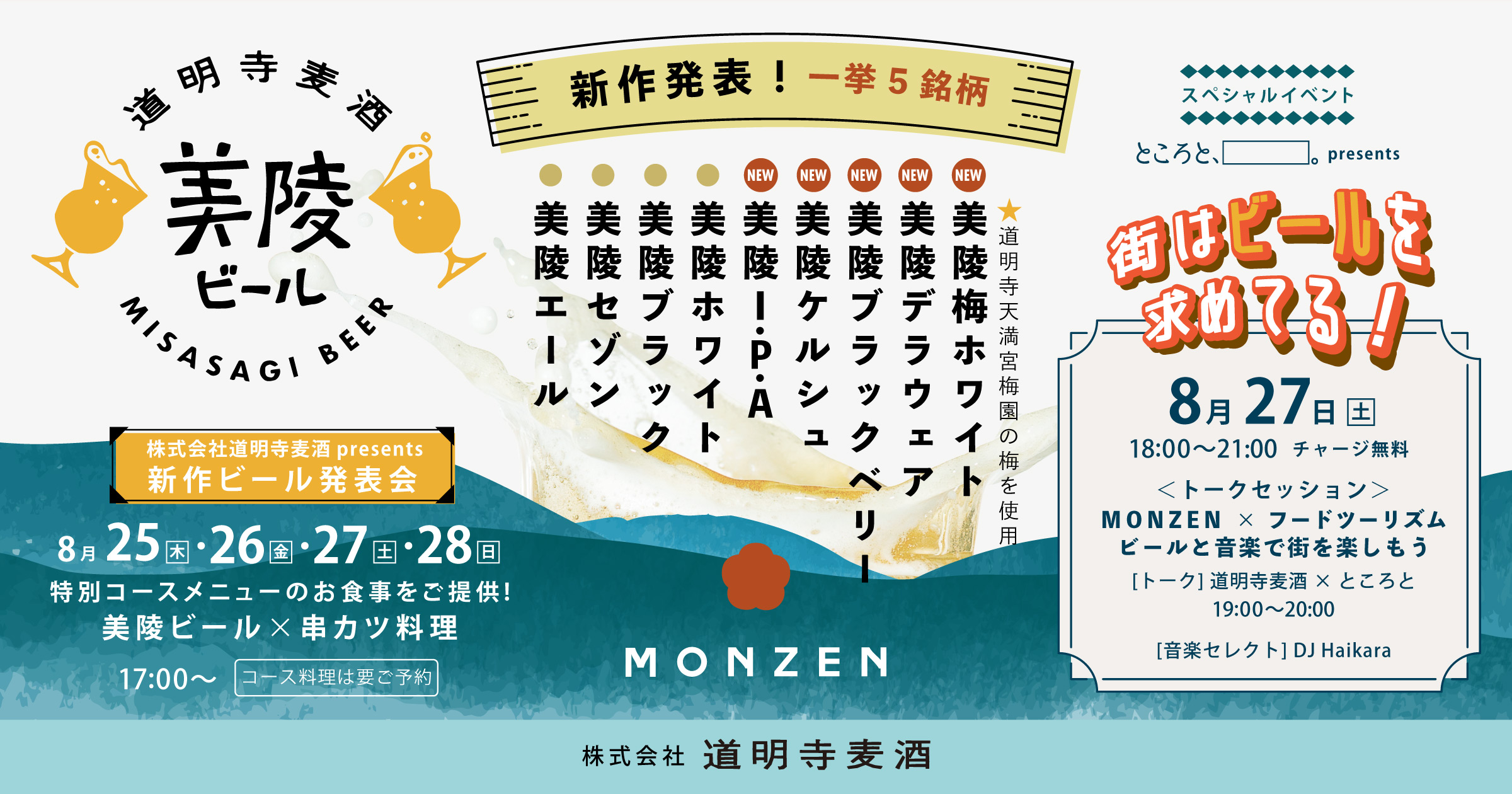 また、同日には、道明寺MONZENにて、道明寺麦酒・美陵ビールの新作発表イベントも行われます。
