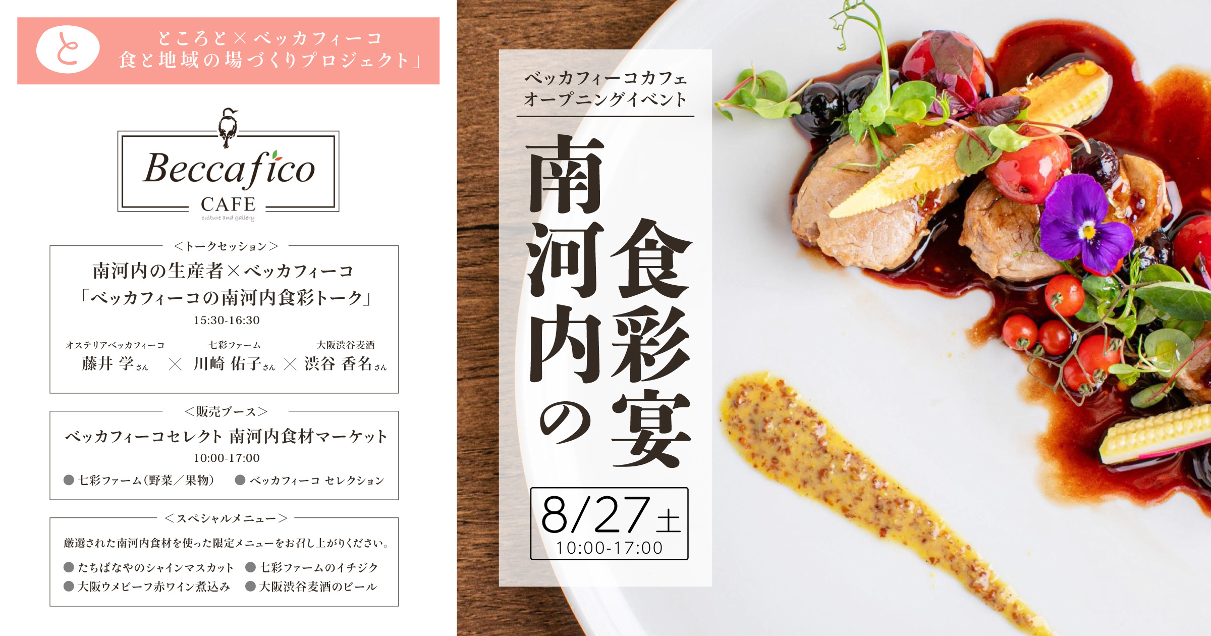 “南河内食材を広めてゆく”という事に特に力を入れて取り組んでいる、イタリアンレストラン「Osteria Beccafico(オステリアベッカフィーコ)」の2階スペースに、新たに「食」を通じて南河内の新たな魅力を発信する拠点Beccafico CAFE(ベッカフィーコカフェ)がオープンします。オープンを記念して、ベッカフィーコがセレクトする食材が並ぶマーケットと南河内の生産者×ベッカフィーコのトークセッションを開催します。もちろんオステリア ベッカフィーコでのお食事も楽しんでいただけます。厳選された南河内食材を使った限定メニューをぜひお召し上がりください。